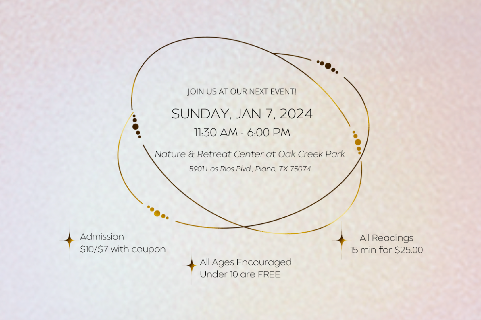 Dallas Psychic Fair Sunday, February 4, 2024 12:00 PM 6:00 PM Dallas Psychic Fair 5901 Los Rios Boulevard Plano, TX, 75074 United States (map) Google Calendar ICS